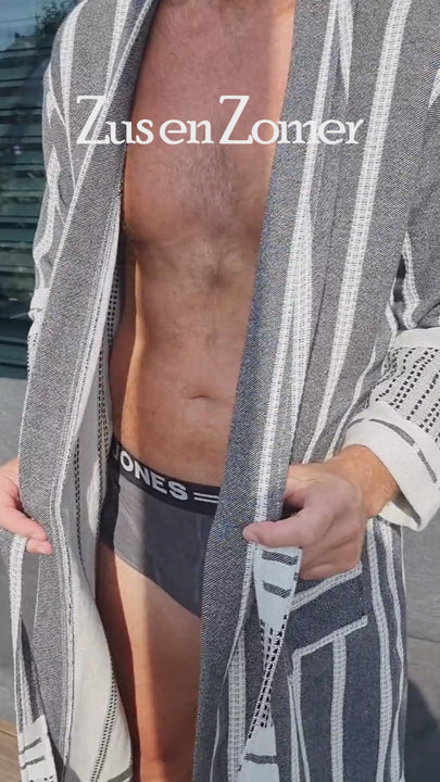 Dieser Bademantel ist sehr stilvoll in Schwarz und Weiß gehalten. Das 2-farbige Gewebe der Hamamtücher, aus denen dieser Damen- und Herrenbademantel gefertigt ist, ist schön und von schwerer Baumwollqualität. Nur in einer PLUS GRÖSSE erhältlich! Damen: Größe 40 - 46. Männer von 180 - 188 cm. Perfekt für den Sommer (als Sommerbademantel) oder wenn Ihnen normale Bademäntel zu warm sind. Natürlich auch ideal für die Sauna, zum Campen und als leichter Bademantel im Reisegepäck.