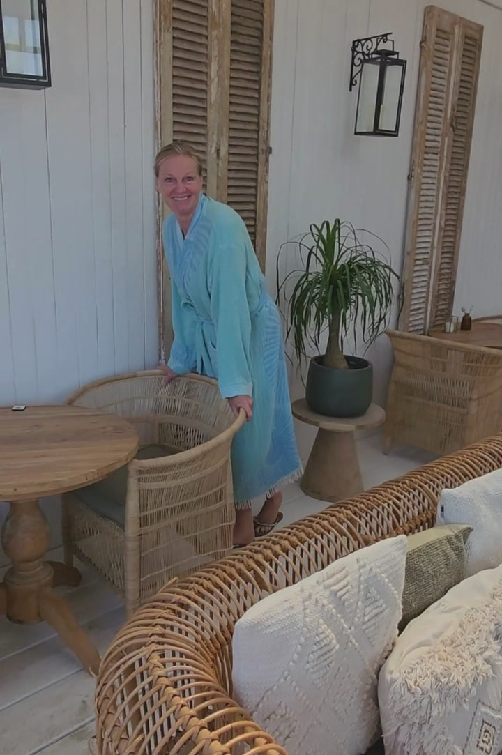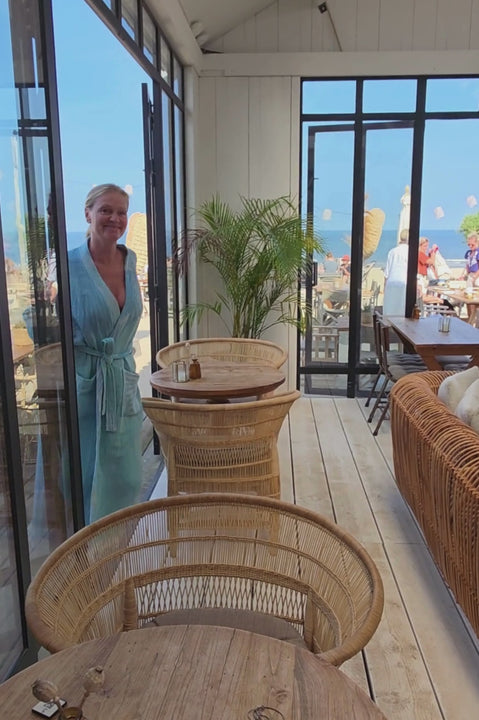 Tijdelijke aanbieding! Prachtige katoenen badjas. Stijlvol en kleurrijk. Mooie mix van kleuren. Leuk met de franjes aan de onderzijde. De badjas valt lekker luchtig en soepel, want is gemaakt van hamamdoeken waarbij veel handwerk aan te pas komt. Perfect voor in de zomer (als zomer badjas) of als je standaard badjassen te warm vindt. Natuurlijk geweldig voor de sauna, de camping en handig mee te nemen als lichtgewicht badjas in je bagage.