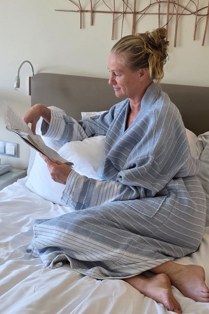 Deze badjas is gemaakt van hoogwaardige hamamdoeken en nemen daarom ook uitstekend vocht op. De badjas voelt zacht en luxueus aan. Anders dan traditionele dikke badjassen, is deze lichtgewicht variant comfortabel, soepel en luchtig.